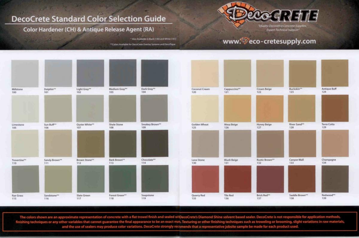 One advantage of coloring with color hardener is certainty of color. Because the pigments are pre-mixed, a truer color can be achieved. Deco-Crete Supply's color hardeners use only the finest pigments available and ensure a uniform, UV stable colored surface (see Color Hardener Chart).